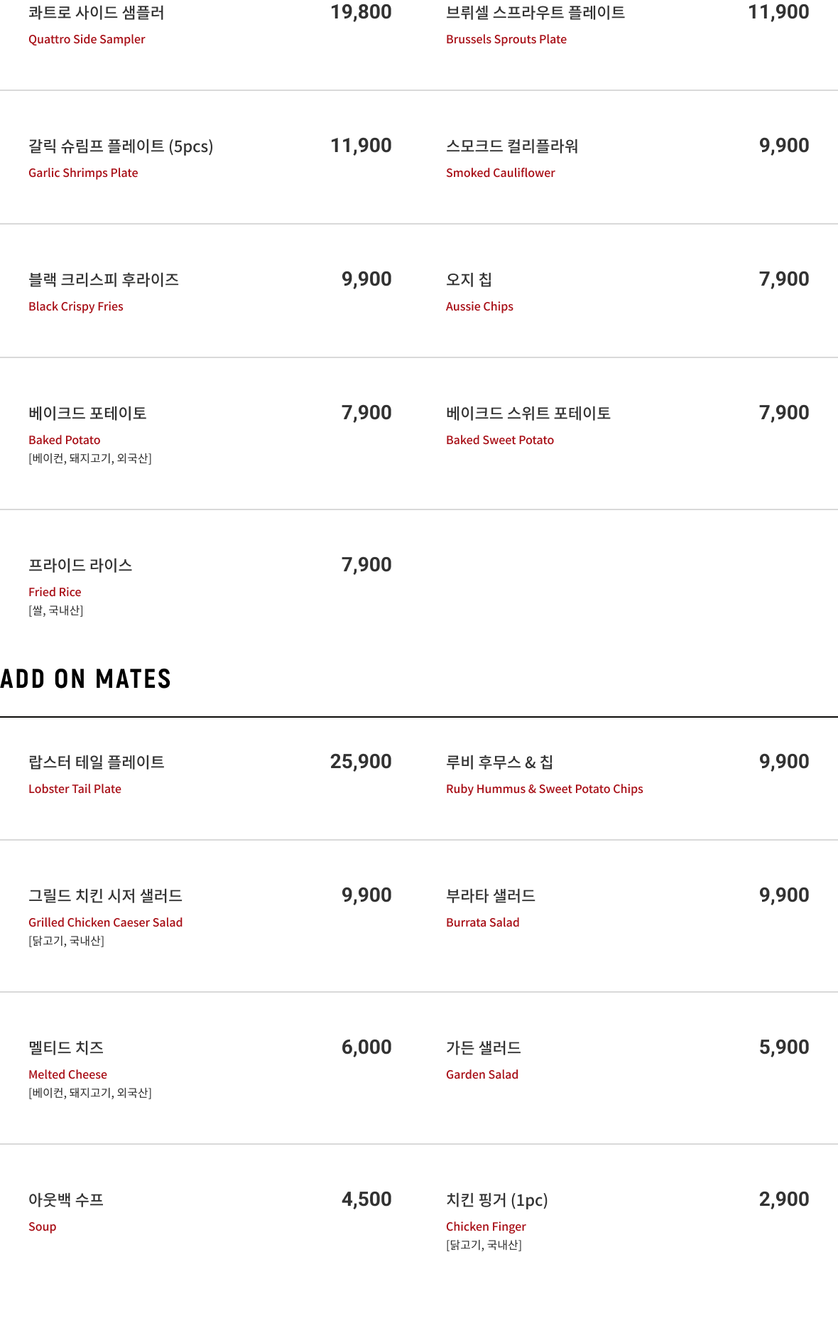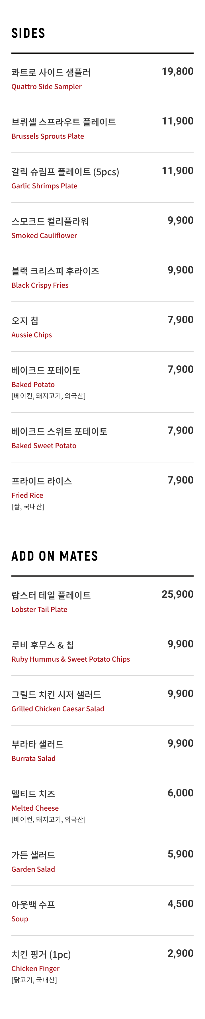 - 매장 사정에 따라 일부 매장의 메뉴는 홈페이지 메뉴와 상이할 수 있습니다. - 메뉴별 자세한 원산지 정보는 매장 내 아웃백 대표 원산지 표시판 참고 부탁드립니다. - 일부 매장의 경우 가격이 상이할 수 있습니다.